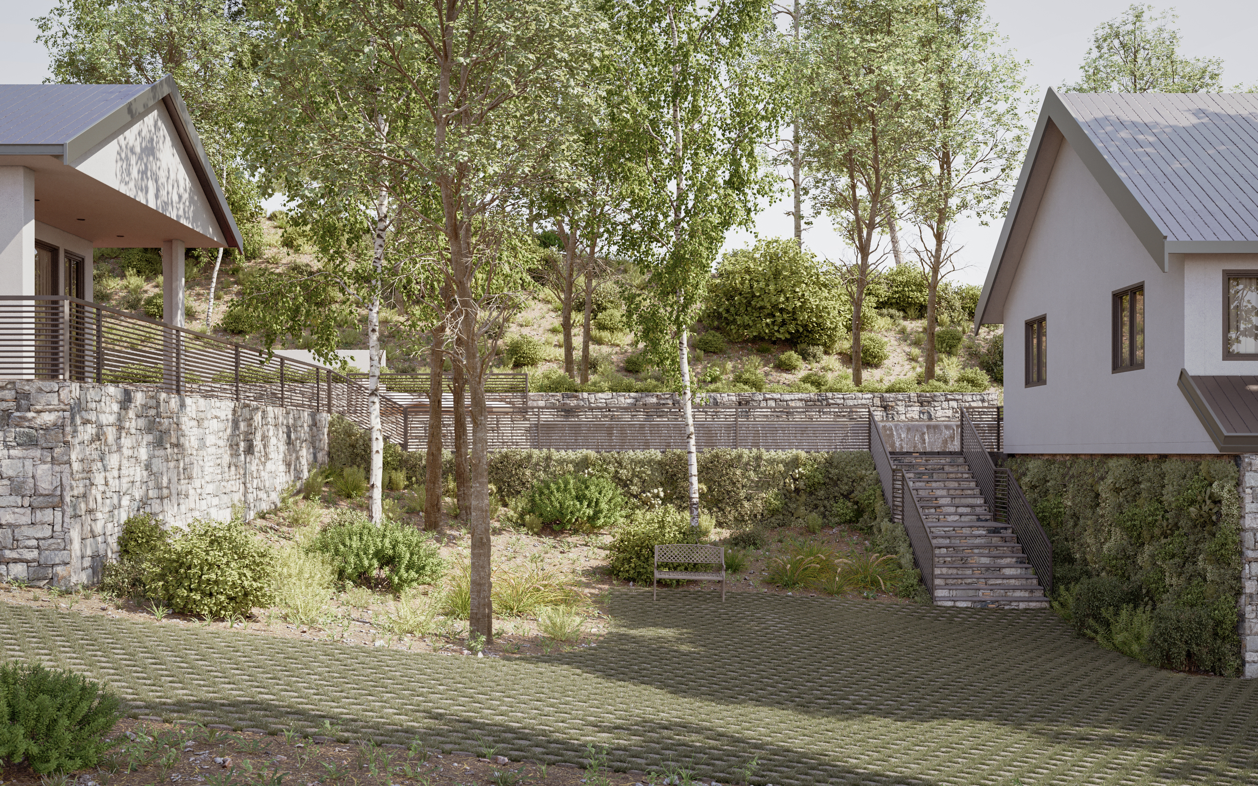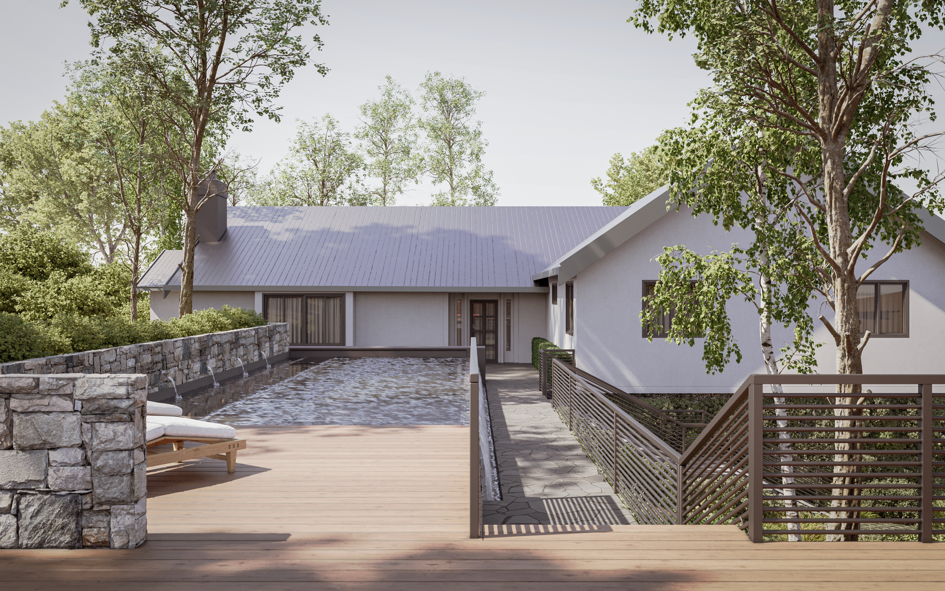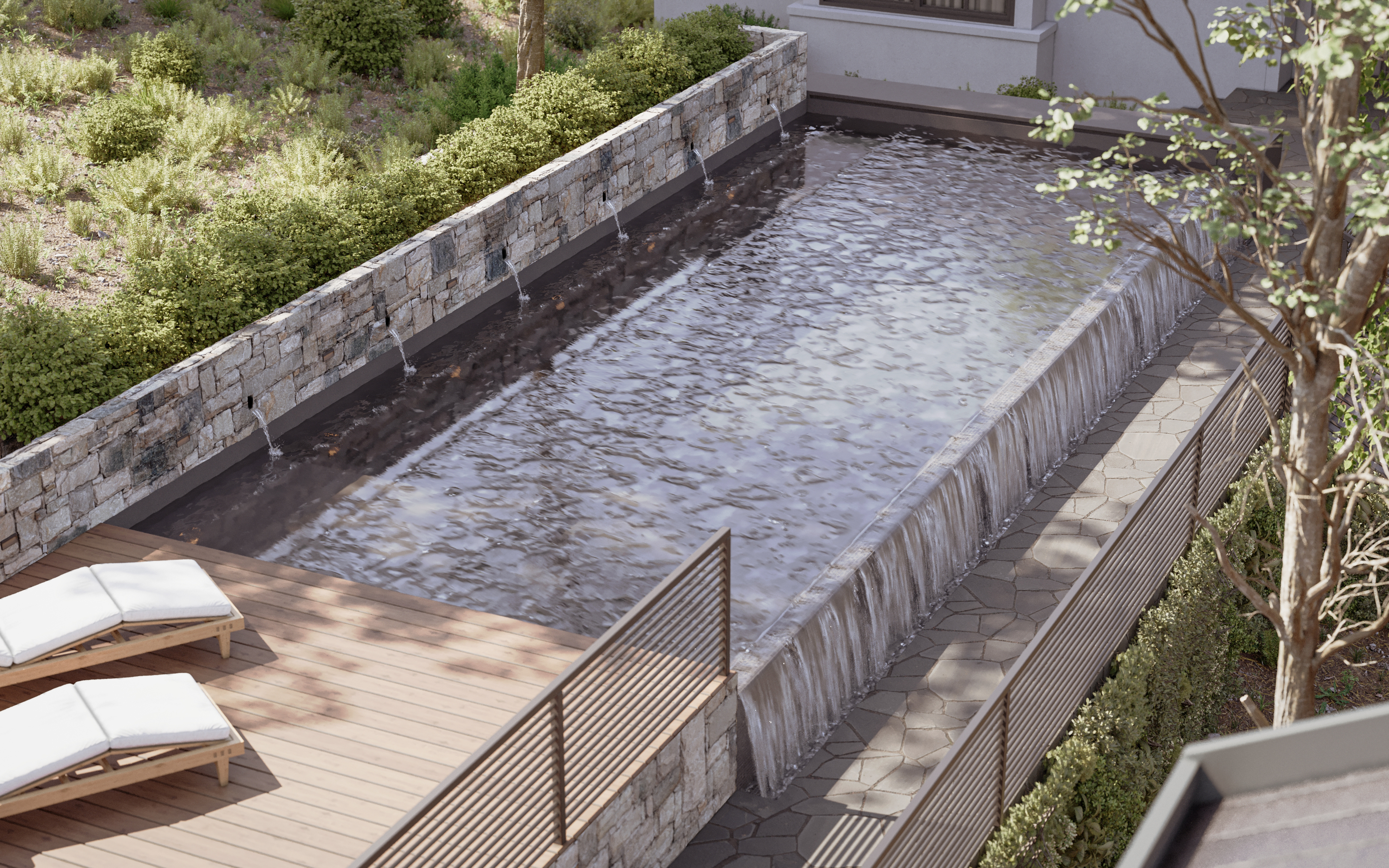 The project transforms the existing context by integrating a modern pool as a unifying element between the main residence and a newly constructed ADU (Accessory Dwelling Unit). The pool serves as a central feature, seamlessly connecting the two structures while enhancing the aesthetic and functional harmony of the site. A striking waterfall runs along the entire length of the pool, creating a dynamic and inviting focal point that elevates the welcoming atmosphere of the main residence. Designed with minimal excavation to preserve the natural terrain, the project adheres strictly to urban forestry code requirements, ensuring sustainability and environmental compliance. The landscape design balances modern elegance with ecological responsibility, promoting a cohesive and serene environment for the residents while respecting the surrounding urban fabric.