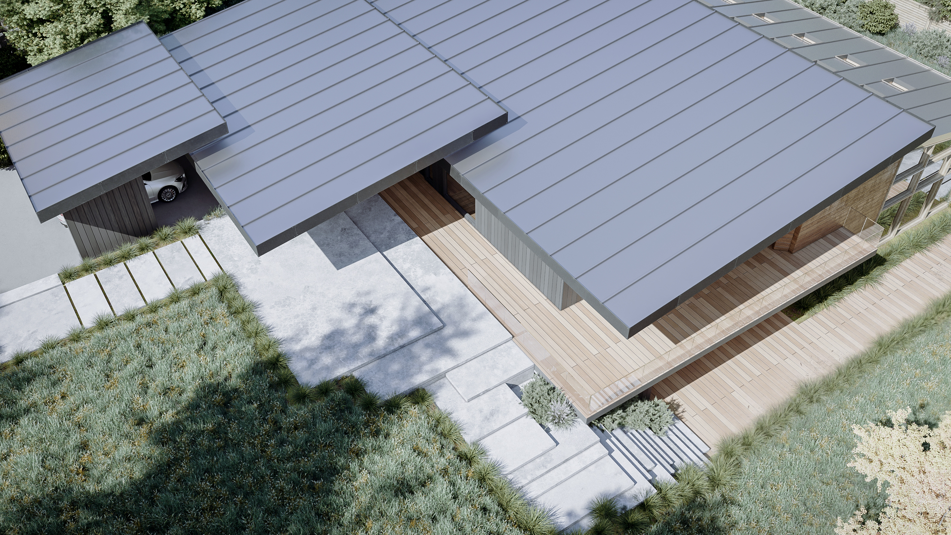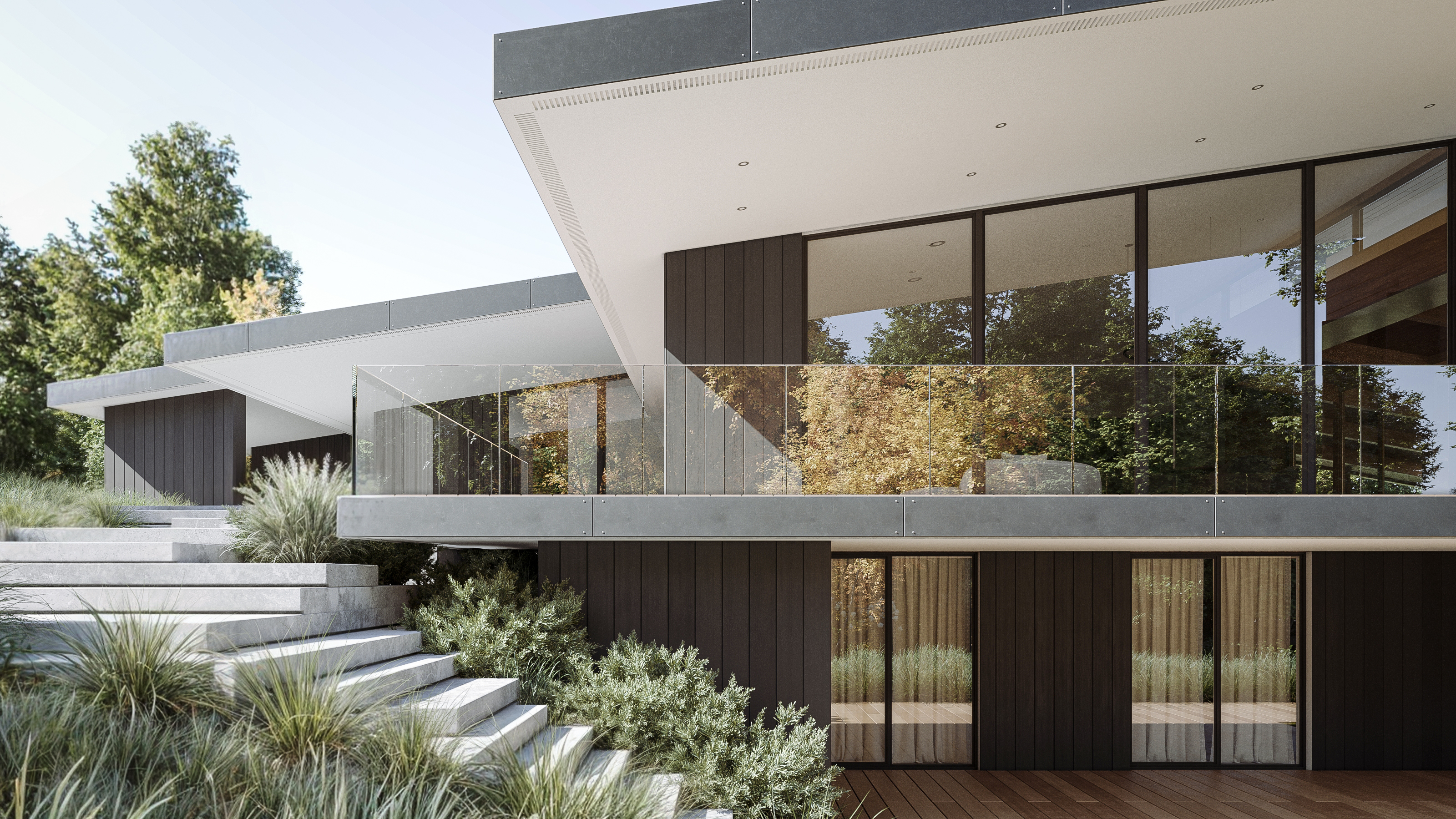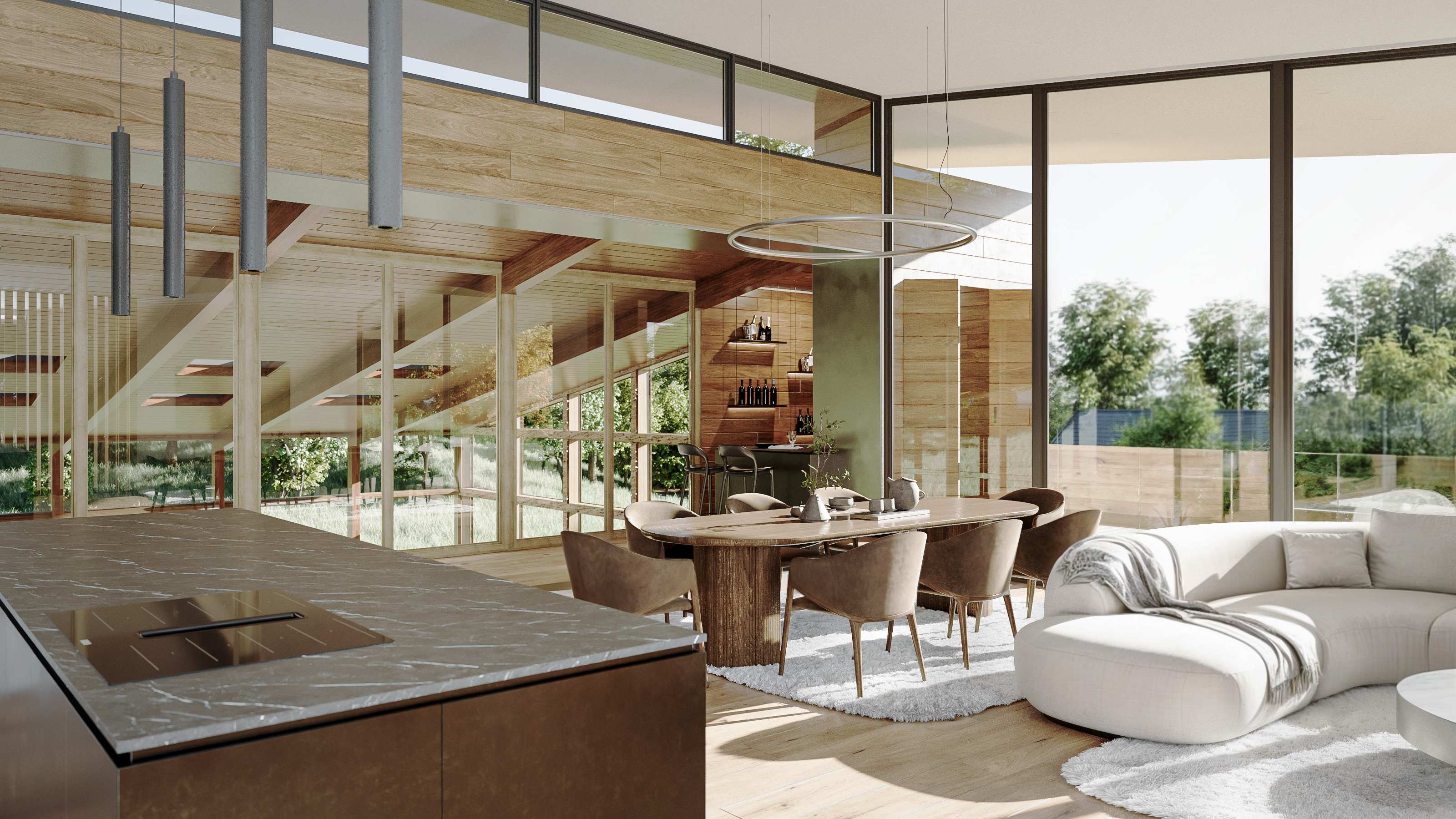 The project revitalizes an existing structure, transforming it into a harmonious blend of modern design and rustic charm. By reusing the building's original framework, the design prioritizes sustainability and budget efficiency. The new architecture juxtaposes sleek, contemporary elements with the warmth of cottage-style aesthetics, creating a balanced interplay of materials and textures. Cold materials such as steel, concrete, and glass are seamlessly integrated with warm, natural wooden accents, evoking a sense of grounded elegance. Expansive glazing invites natural light, while timber-clad interiors and textured surfaces provide a cozy, inviting atmosphere. This fusion of modernity and tradition ensures a timeless design that respects the building's past while embracing its future.